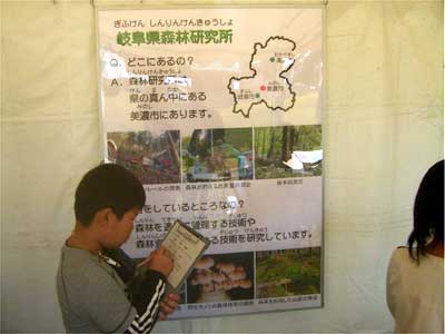 岐阜県森林研究所は,2006年10月28,29日に岐阜県庁前広場で開催された「森と木とのふれあいフェア2006」の“森で遊ぼう”のブースにおいて「クイズに答えてしおりをつくろう」と題して出展しました。