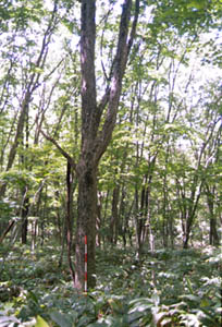 一方、写真−2のミズナラは枝下高が4mですが胸高直径は47cmあります。周囲のほとんどの木の胸高直径が22〜37cm(枝下高は10m以上)であるのに比べひときわ大きいものです。