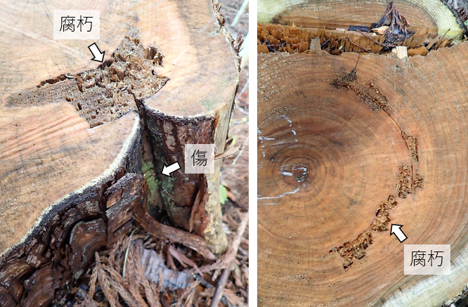図1. ヒノキ根株腐朽被害 左:菌の侵入口が樹幹傷の腐朽被害右:侵入口が不明な腐朽被害(根等が考えられる) |