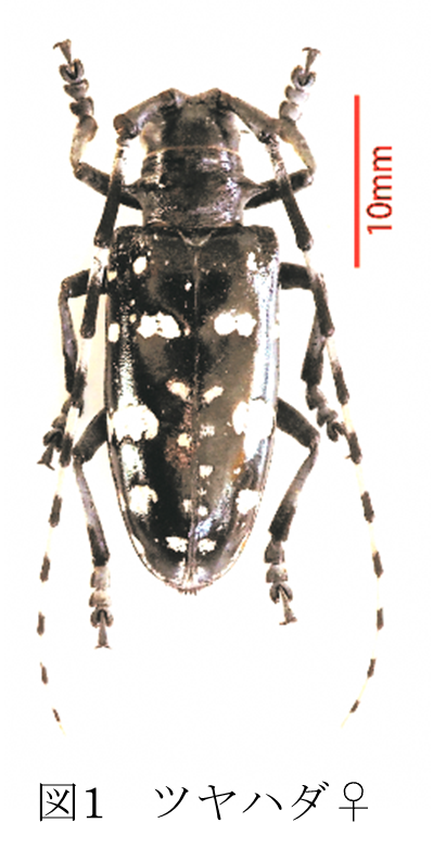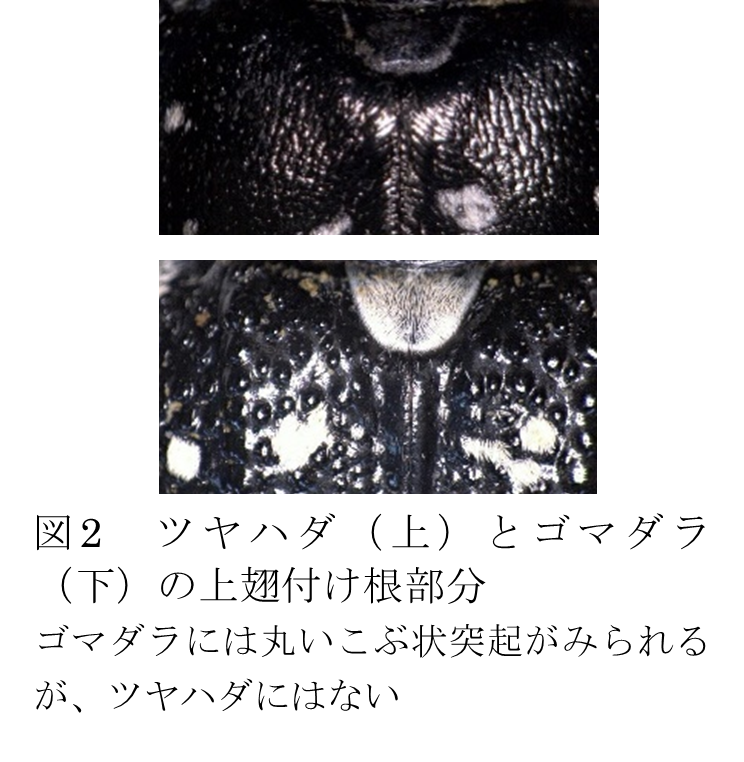 カミキリと言えば本種を思い浮かべるほど馴染み深く、果樹類の害虫としても有名です。両者の外観はよく似ていますが、区別点として、ゴマダラには上翅付け根(図2)にこぶ状突起が多数ありデコボコしているのに対し、ツヤハダではつるっとしています。