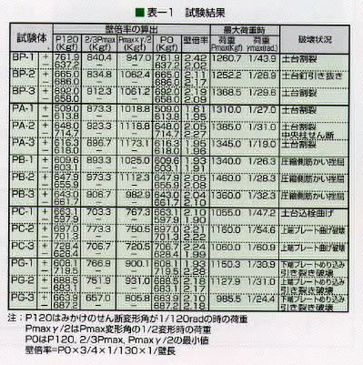 図-2に、試験体の荷重と変形角の関係を、最外部を辿った包絡線で示しました。またその結果を表−1に示しました。
