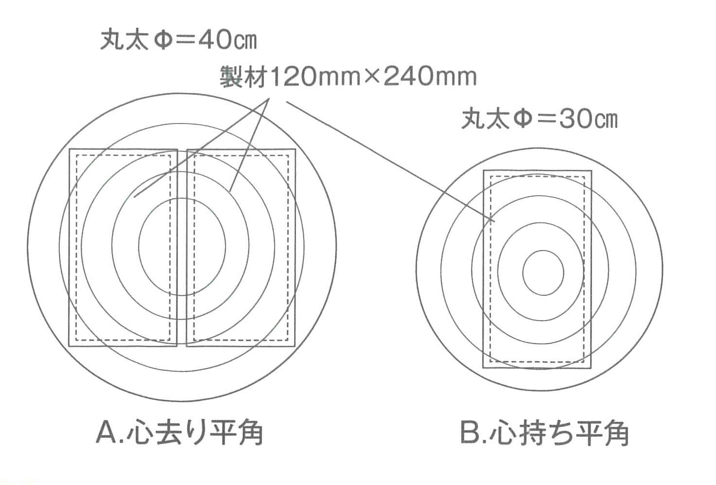 原木市場等に流通するスギ材の大径化が進んでおり、末口径40cm程度の丸太も珍しくありません。このような丸太からは、仕上がり寸法120mm×240mmの平角材を2丁取り(図1A)することが可能となり、今後は、心持ち平角材(図1B)に替わり、心去り平角材が増加することが予想されます。